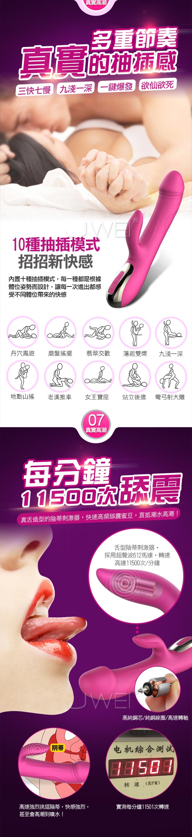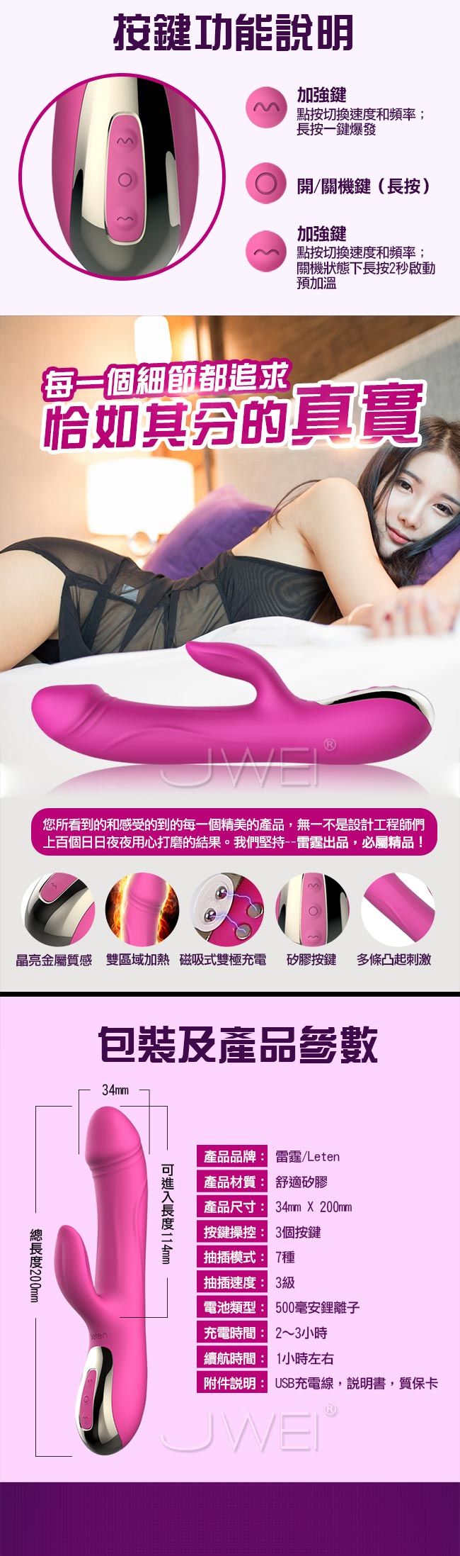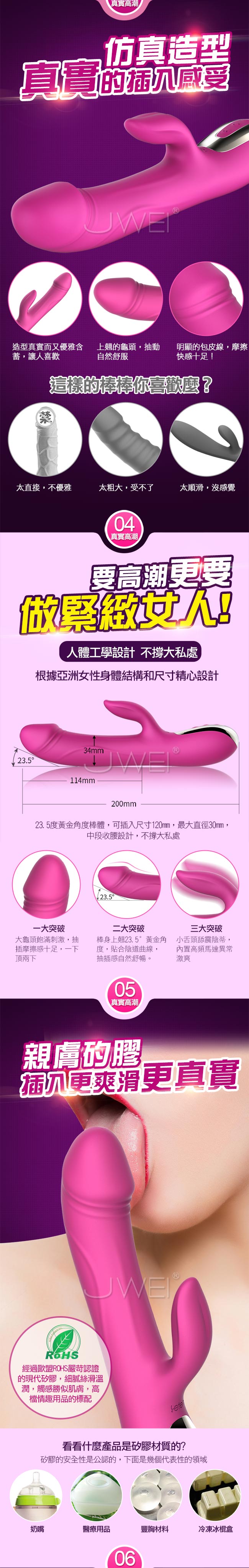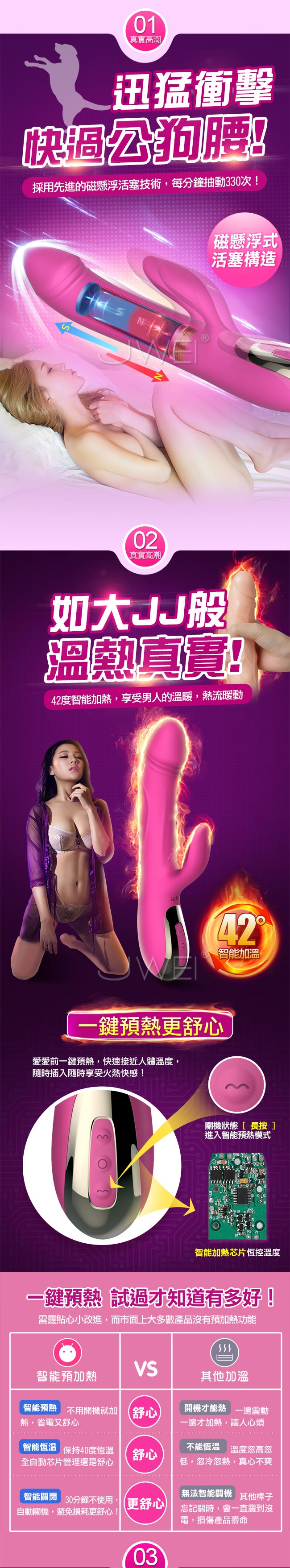 迅猛衝擊,讓您享受欲仙欲死的快感,磁懸浮式的活塞技術讓每分鐘抽動330次,快過公狗腰讓您不要不要的~~老二般仿真造型上翹的龜頭自然抽動磨擦感十足,親膚矽膠插入更滑順舒適,還擁有智能加溫享受如男人般的溫暖真實,可一鍵預熱讓您不用開機也能加熱!!符合人體工學的設計不撐大私處讓您能安心使用!內置10種抽插模式根據不同體位設計招招使您體驗到不同的性愛快感,加上舌型陰蒂刺激器快速舔震雙重快感下讓您直抵高潮喔~並且貼心設計低噪防水讓您能在多種場合愛愛,不必擔心隱私被發現喔~採用USB磁吸充電隨插隨爽使用方便喔~