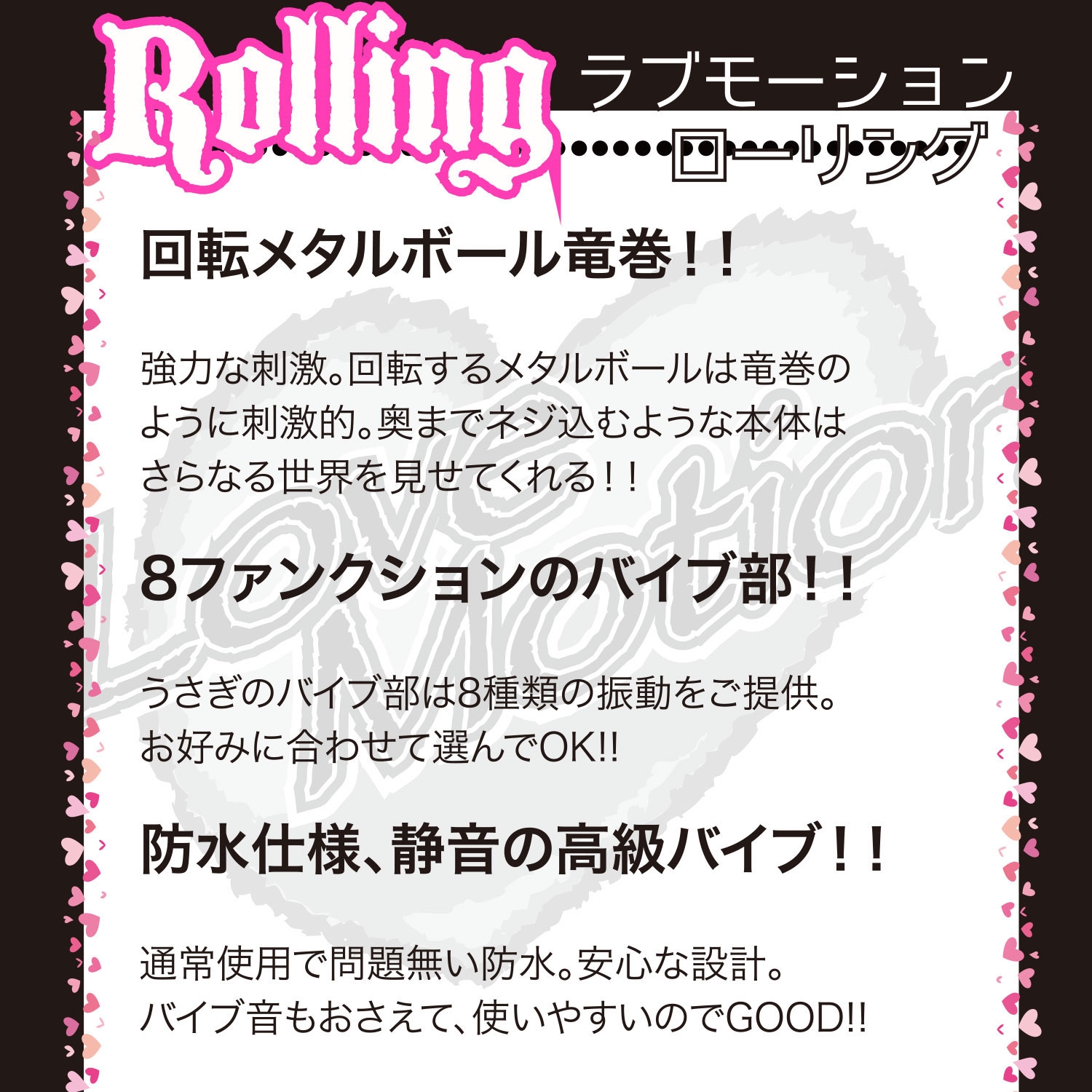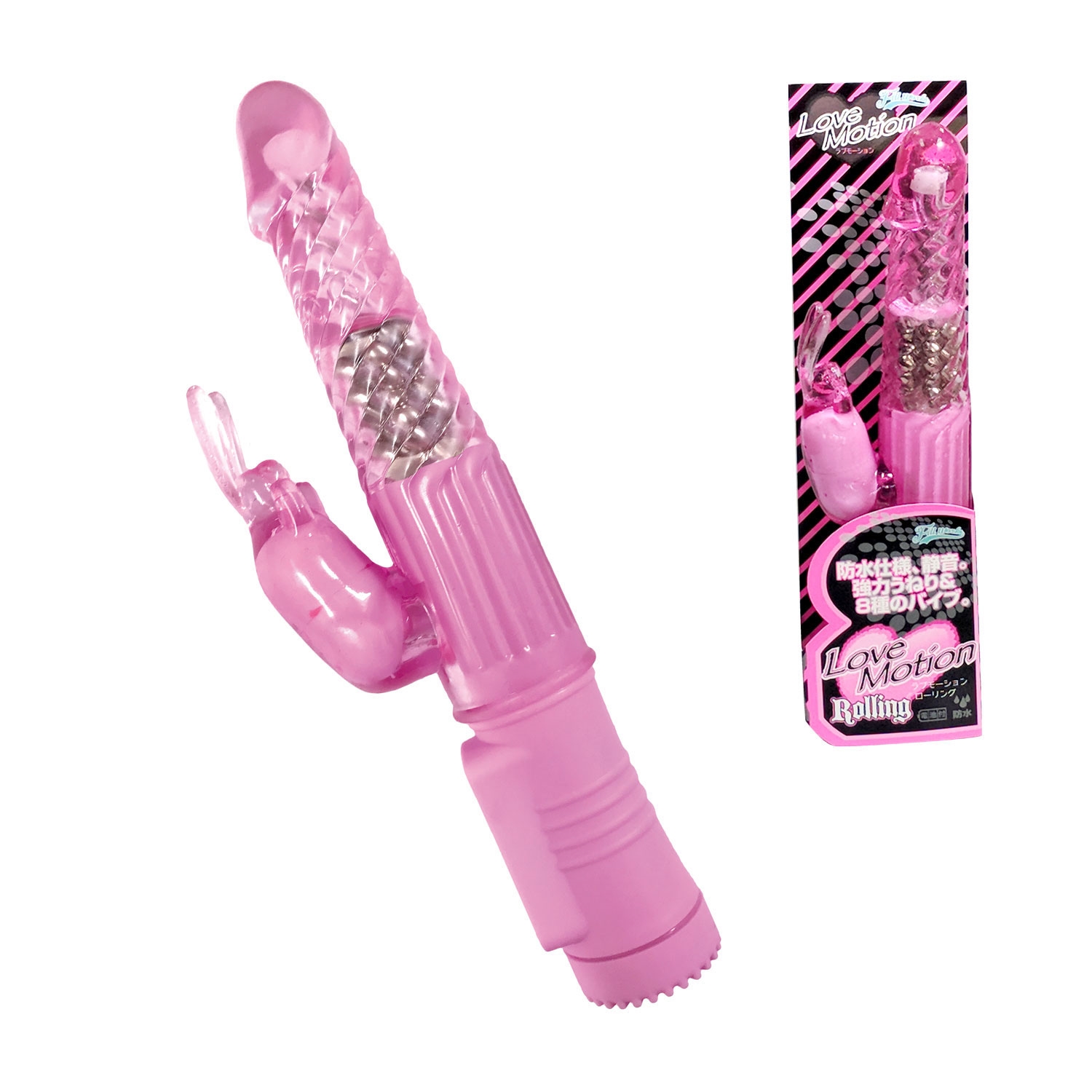 バイブ部:強弱4段階 ローター部:8ファンクション、そして、バイブ部に回転切替機能搭載、正転・反転・ミックスの3種類。