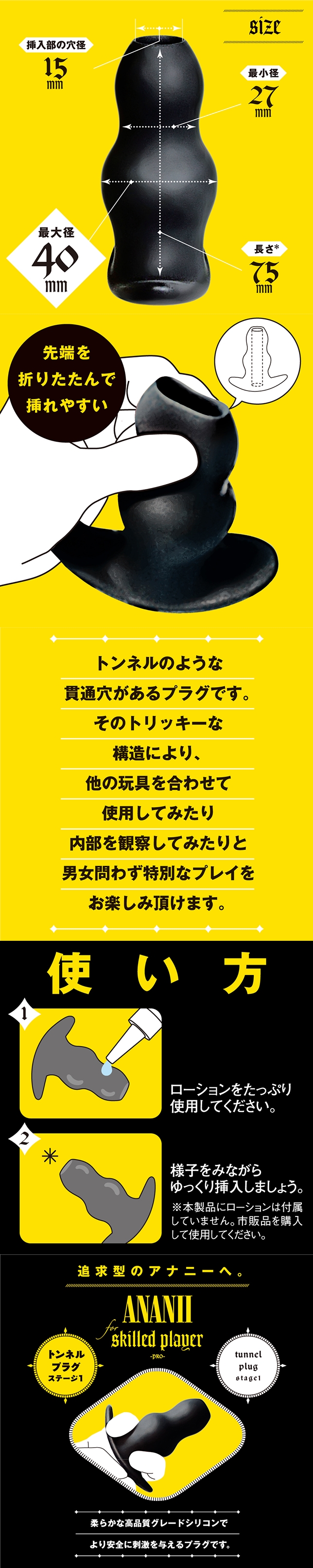 PPPからアナニー上級者に向けた■ ANANII for skilled player [PRO]■第2弾!スタンダードな造形に対し『最大径40mm』の本体をトンネル状に通った穴が特徴的なプラグです。その構造と弾力あるハイグレードシリコン素材により、他の玩具を併用して挿入したり、先端を折りながらすこしづつ広げるように挿入したりと、プレイのファーストステップからオリジナルの使い方を試行していくことが可能です。