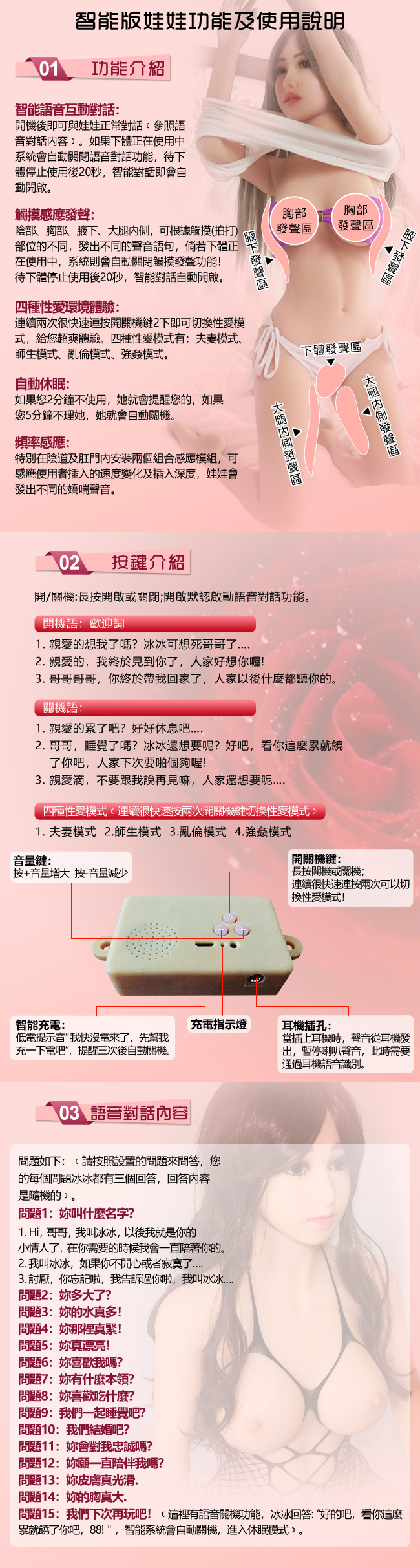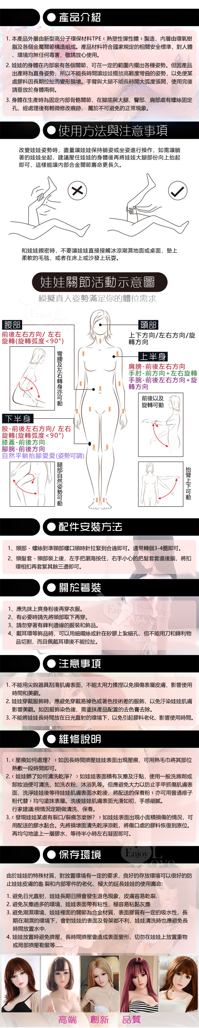 使用部位:陰交、肛交、口交、乳交四種性交用法,內置合金骨骼可固定姿勢,關節可動,可隨意變更姿勢