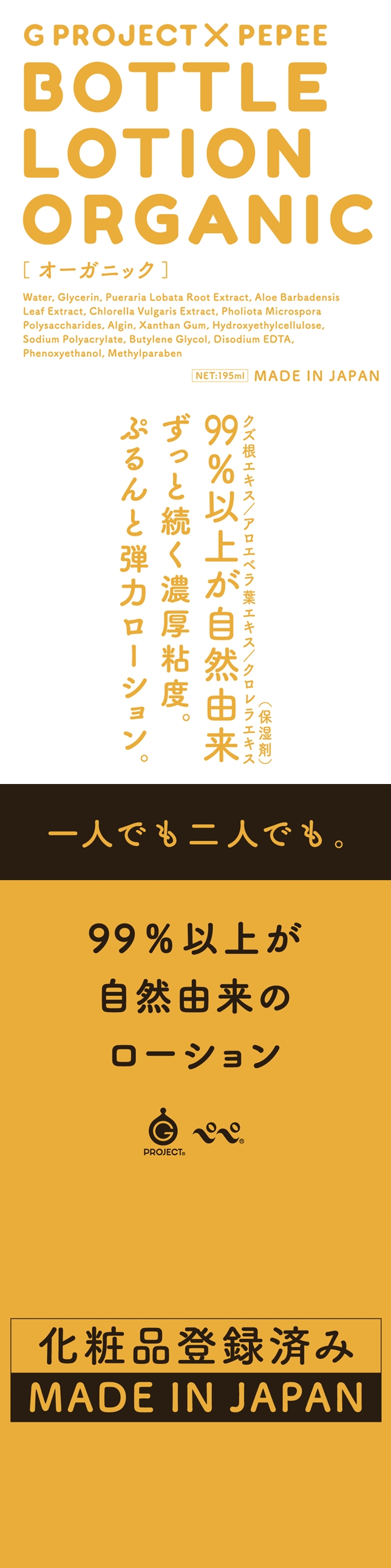 G PROJECT × PEPEE 推出有機潤滑油。內含葛根提取物,蘆薈葉提取物,小球藻提取物。因 99%以上為自然成分,對於肌膚或黏膜都很溫和,所有人都能安心使用。特色在適度的黏度及持續性。一人也行兩人也好,多種情境都能使用。每個商品都是日本國內仔細的製造生產,故可放心直接塗抹在肌膚上使用。MADE IN JAPAN
