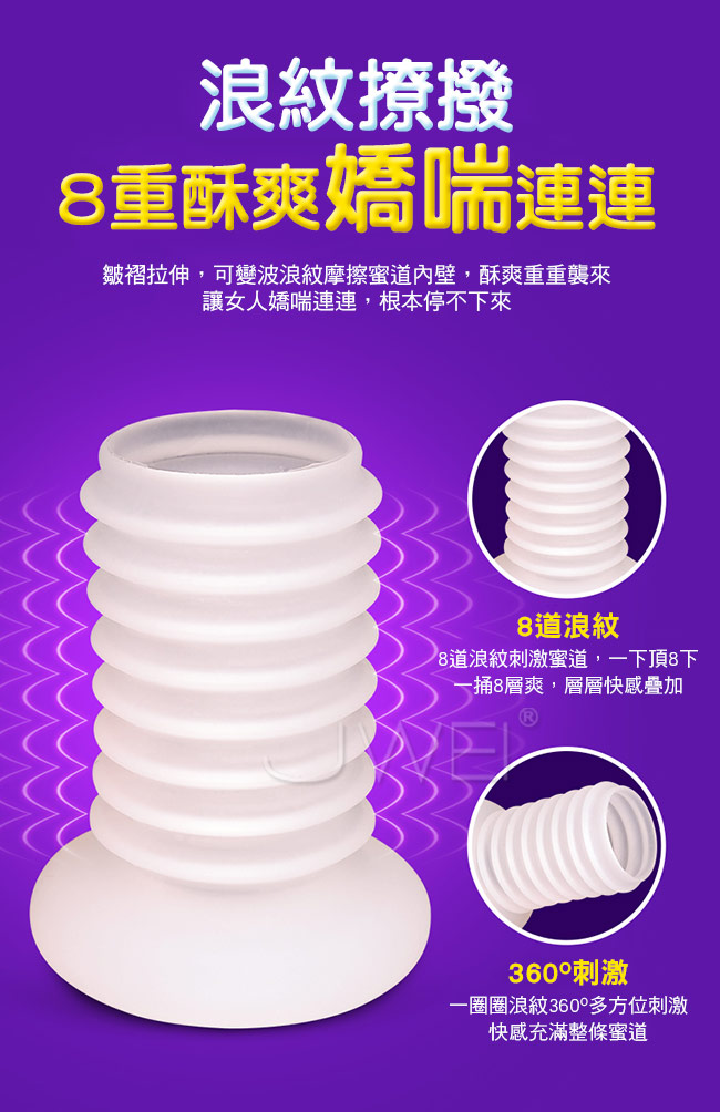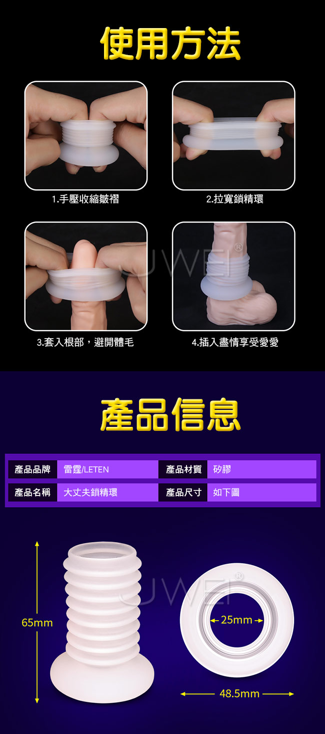 大丈夫鎖精環採用風琴式皺褶設計能伸能縮,拉伸可變成8道浪紋刺激蜜道,層層快感疊加讓女人更快抵達高潮,收縮可緊箍丁丁根部,加強鎖精,讓男人更為久戰。此款鎖精環採用柔軟溫潤矽膠,親近人體肌膚戴入舒適,無異物感讓您安心使用。且彈力十足符合男人各種尺寸喔~