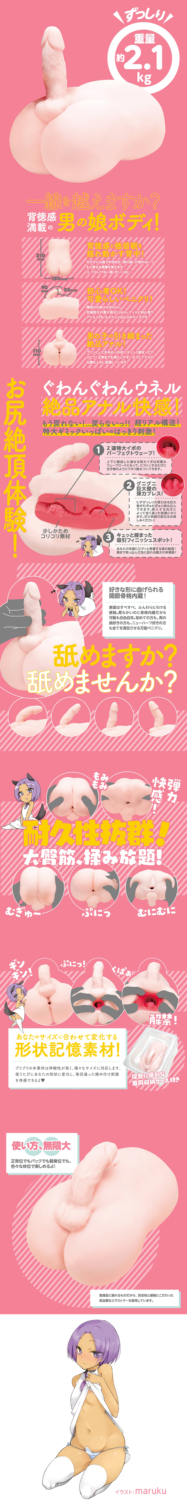 新世界!喚醒扭曲性癖的終極自慰套!重約2.1公斤的偽娘自慰套,想要越過那條線嗎?背棄道德感滿滿的偽娘身體,「不該這樣做的」的刺激感!新手也OK!可愛的棒棒長度為90毫米。前端部分最大直徑為32毫米。適合推薦給假陽具或肛交新手等使用的小尺寸。肛門的位置較高,因此即使在正常體位也可以輕鬆插入。請盡情享受這個男孩緊緊而精緻的肛門!正常體位也好後背體位也好,可以享受各種不同的體位。由於會直接與皮膚接觸,因此特別注重安全性和使用触感的高質量彈性體。棒棒內置關節骨架,可以彎曲成任何形狀!表面光滑柔軟,儘管很柔軟,但因具有內置的骨架,所以可以自由活動。多功能的棒棒,無論是新手,喜歡偽娘的人還是性別轉換者,所有人的需求都能滿足。可以任意揉搓大臀部,並具有出色的耐用性!回不去了... 再也回不去了!!超真實特大設計的構造,給您清晰刺激!波浪形的內部,精緻的肛門新快感!雙重特大顆粒的完美波形,具彈性的通道壁給您加壓。緊緻的吸力點帶你到達頂端!就是屁股高潮體驗!會根據您的尺寸而變化的記憶形素材!這種素材具有很高的彈性,可以對應各種尺寸。每次使用時,會根據您而改變形狀,每次都會遇到不同的緊緻刺激感。內附方便存放的專用收納盒。包裝插畫師:maruku審查編號:2004355