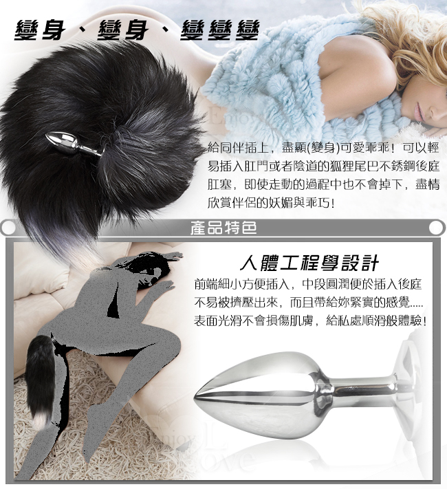 女人狐媚之美,盡在不銹鋼狐尾巴後庭塞! 變身cosplay用具就是這麼神秘,插上肛門塞就變成迷惑狐狸了。 給愛人插上,盡顯狐狸的野性及撫媚!即使走動的過程中也不會掉下,更不用說對此尾巴拉拉扯扯過程中帶來的快感和樂趣...... 快快行動!可以變化的可愛狐狸就是你! 【產品目的】本品是成人遊戲的最佳選擇。體驗另類性愛,增進情趣。 【使用方法】想怎麼玩就怎麼玩!加些潤滑油,慢慢插入肛門或陰道,享受極品性生活。 【顏色規格】中號 (詳如圖) 【產品包裝】超厚款拉鍊收藏袋裝