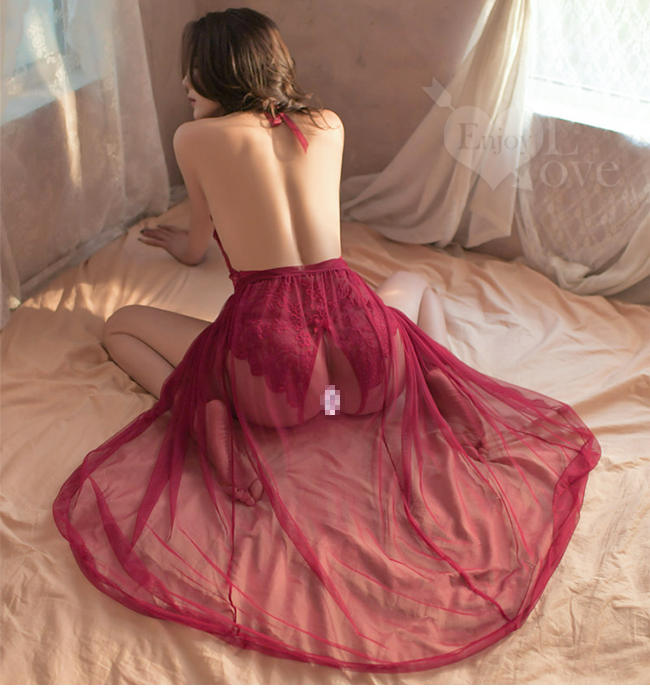 | 狂野連身衣!V領清透花卉裸背開襠連身衣含紗裙兩件組﹝紅﹞