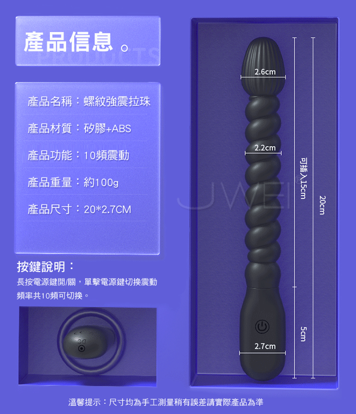 新手開肛神器,解鎖後庭新潮,陰肛兩用深入探索,體驗多重快感;拇 指大小新手也能簡單玩,圓潤頭部輕鬆進入;10頻強震,酥麻強震,連環刺激;柔軟親膚,任意彎曲,刺激後庭每一個敏感點!