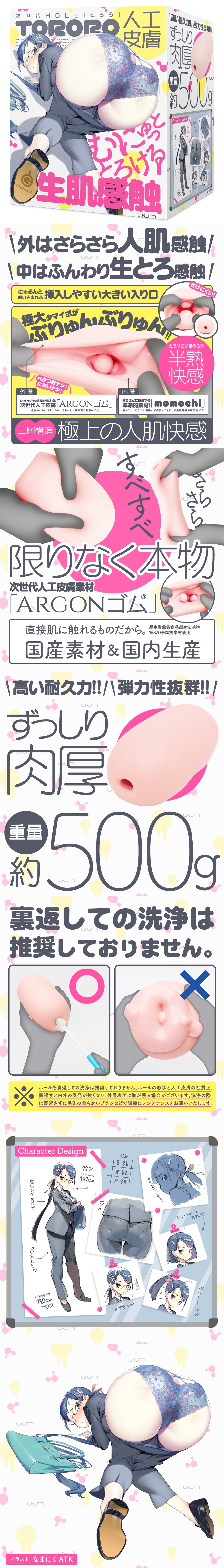 感覺就像真人肌膚一樣柔軟的觸感!與極度豐滿的球狀肉粒相互融合、交織在一起的新一代半熟快感自慰套!就像一邊按搓揉胸部一邊插入一樣不可思議的感覺?!。外層採用改變傳統觀念的新一代人造皮膚素材『ARGON』。這是一種柔軟而不會黏答答的新型素材,再現了真人肌膚的觸感。內層採用革命性素材『momochi【soft】』,會隨著用家使用而變得更貼合用家,跟真人肌膚一樣有彈性的新素材。雙層結構實現了極佳的真人肌膚感。使用可安心直接接觸皮膚的日本國產素材以及在日本國內生產MADE IN JAPAN。包裝插畫師:なまにくATK