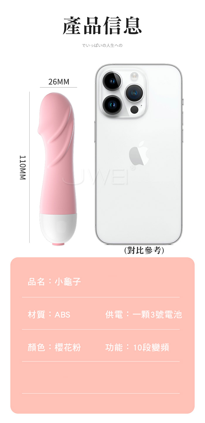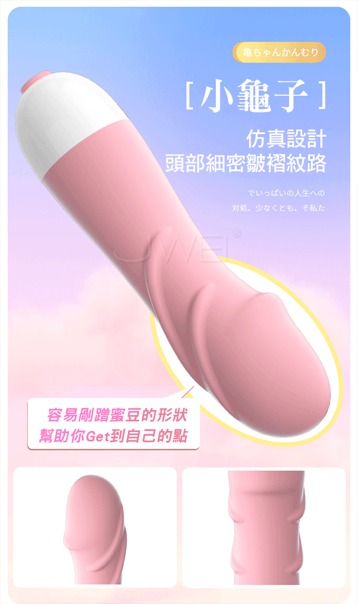 小龜子仿真設計,頭部細密皺褶紋路,容易剮蹭蜜豆的形狀,幫助你Get到自己 的點;小巧不撐大,不怕撐大,貼心收腰設計;順滑材質,貼合你的身體;10頻 激顫強勁動力;體型輕巧又便捷,放進化妝包裡,帶去哪裡都可以!