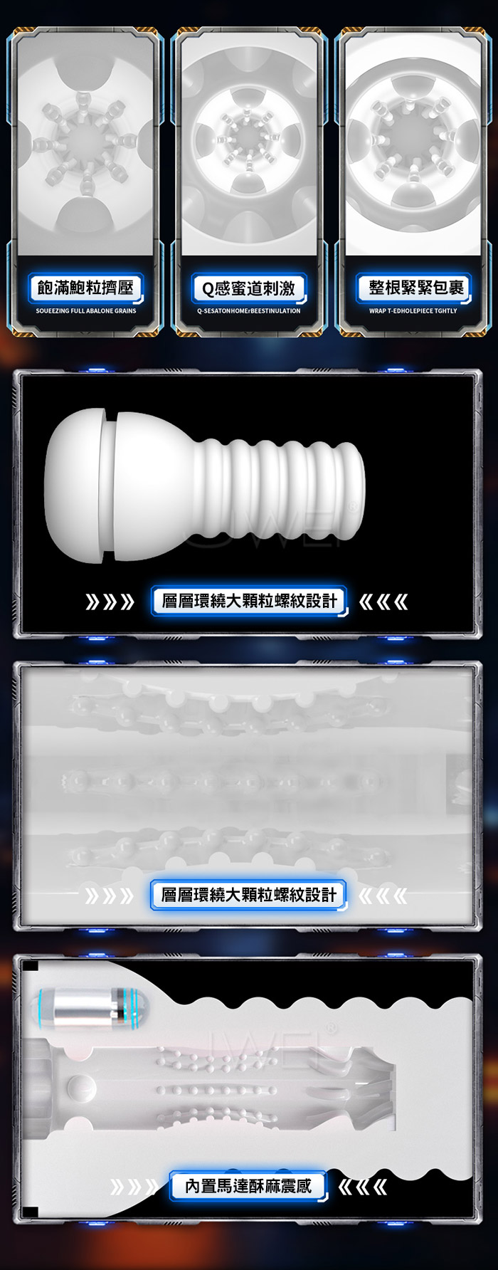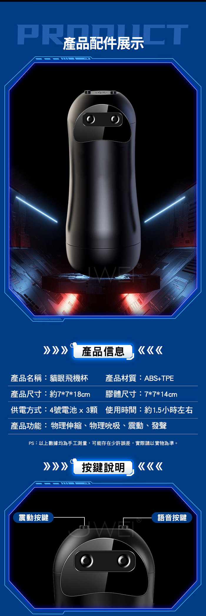 ■尺寸:大小詳如圖片標示 ■材質:ABS+TPE ■重量:4號電池 x 3顆 ■特色:內膽可沖洗、物理伸縮、物理吮吸、震動、發聲