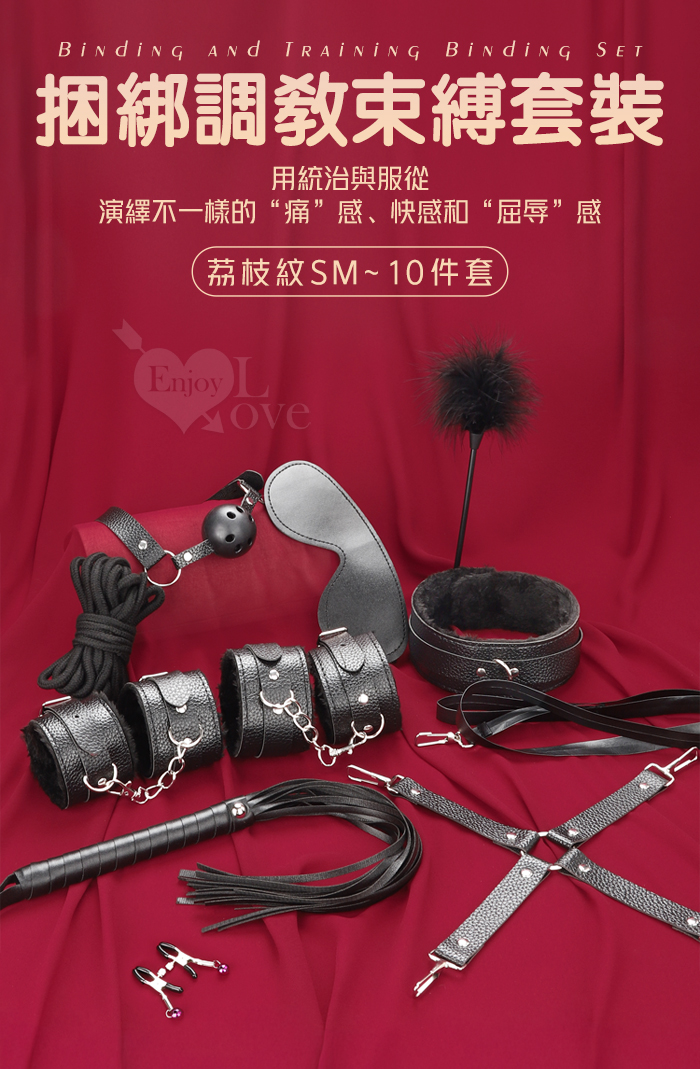 | SM遊戲套組 ‧ 綑綁束缚調教 ~ 荔枝紋皮革/毛絨道具10件組﹝黑﹞